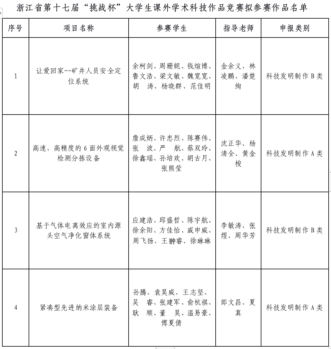 根据《关于组织开展浙江省第十七届“挑战杯”大学生课外学术科技作品竞赛的预通知》相关要求,经温州职业技术学院“挑战杯”校赛公开、公正、公平的选拔,现拟推荐《让爱回家--矿井人员安全定位系统》《高速、高精度的6面外观视觉检测分拣设备》《基于气体电离效应的室内源头空气净化窗体系统》《紧凑型先进纳米涂层装备》四个作品参加浙江省第十七届“挑战杯”大学生课外学术科技作品竞赛,以上参赛团队中周珊妮、鲁文浩、詹成炳、应建浩、邱盛哲、戚申威、方佳怡、周飞扬、王翀睿、袁昊威、王志坚、吴 睿、张建军、俞杭祺、耿 顺、董 昊均为亚洲无码 学生。现将相关作品信息予以公示。