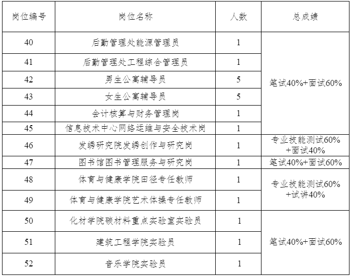 1.考试。学校预计于7月下旬举行所有岗位的考试(具体时间和地点另行通知)。编号46、48、49岗位考试采用专业技能测试的方式(考核内容和方式由用人单位另行通知),其余岗位采用闭卷笔试的方式。根据应聘人员的考试成绩,按照计划选聘人数的5倍确定参加资格复审人员,如遇入围资格复审最后一名成绩相同,则一并列为入围下一环节对象。