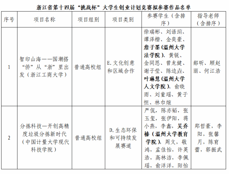 根据《关于举办浙江省第十四届“挑战杯”大学生创业计划竞赛的通知》相关要求,经浙江工商大学、中国计量大学现代科技学院“挑战杯”院赛、校赛等两次公开、公正、公平的选拔,现拟推荐作品《智印山海——国潮搭“侨”从“浙”里出发》、《分拣科技—开创高精度垃圾分拣新时代》参加浙江省第十四届“挑战杯”大学生创业计划竞赛,参赛团队中詹子墨、叶琳慧、吴乔榛为亚洲无码 学生。现将相关作品信息予以公示。
