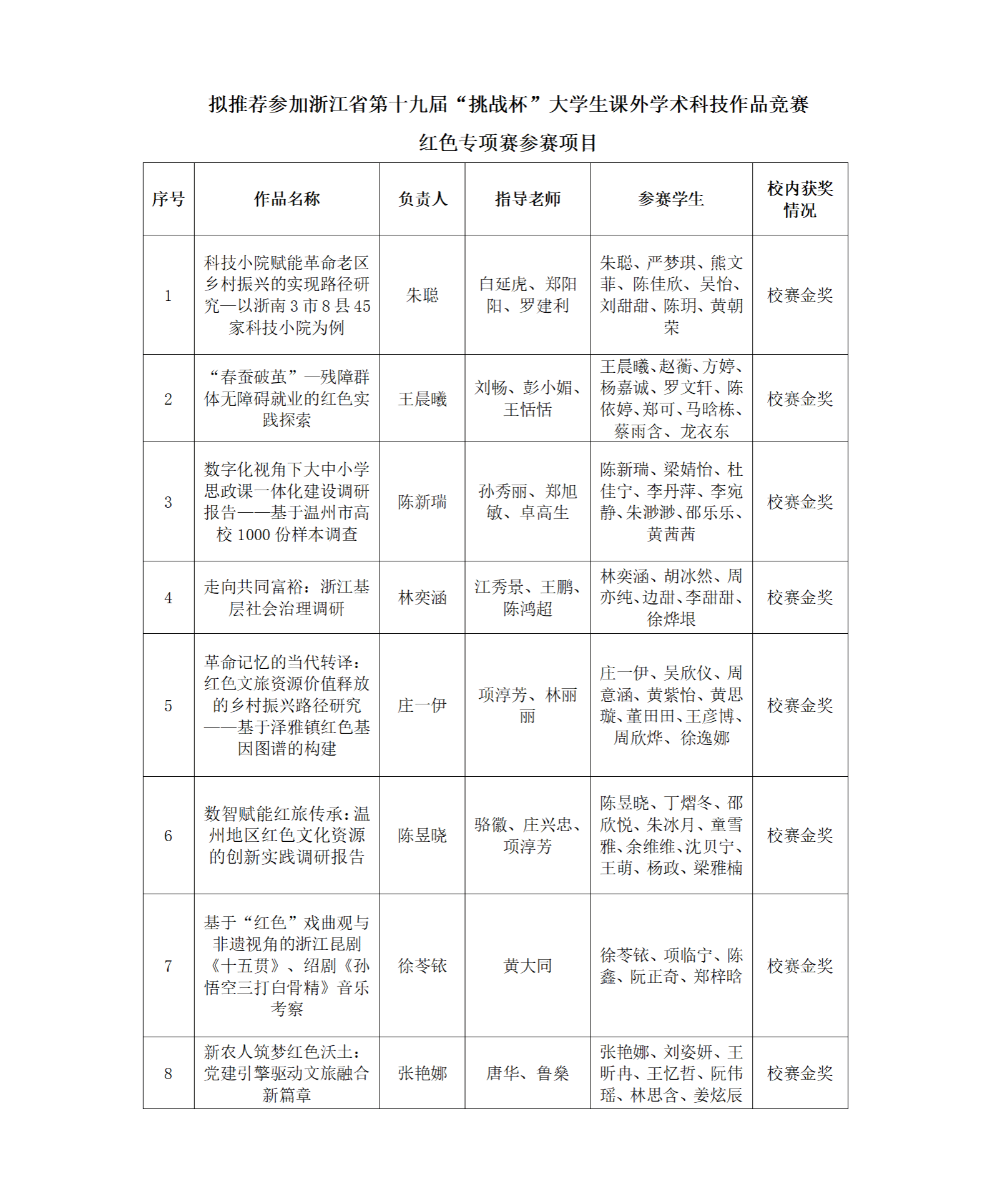 根据《关于组织开展浙江省第十九届“挑战杯”大学生课外学术科技作品竞赛红色专项赛的通知》相关要求,经学校“挑战杯”红色专项公开、公正、公平的选拔,现拟推荐《科技小院赋能革命老区乡村振兴的实现路径研究—以浙南3市8县45家科技小院为例》等8项作品代表亚洲无码 参加浙江省第十九届“挑战杯”大学生课外学术科技作品竞赛红色专项赛。现将相关作品信息予以公示。