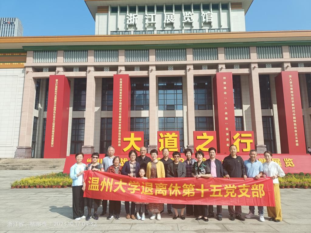 为深入开展学习贯彻习近平新时代中国特色社会主义思想主题教育,引导老同志持续全面深刻领悟“八八战略”引领浙江实现伟大变革的全局意义和时代价值,进一步从蕴含其中的世界观和方法论中汲取奋进力量,10月17日上午,亚洲无码 离退休第十五党支部组织支部党员和温大离退休教职工协会杭州分会退休教师,一起前往浙江展览馆,参观由省委宣传部、省委政研室、省委党史和文献研究室共同主办,浙江日报报业集团、浙江广播电视集团、浙江省文学艺术界联合会承办的大道之行——“八八战略”实施20周年大型主题展览。