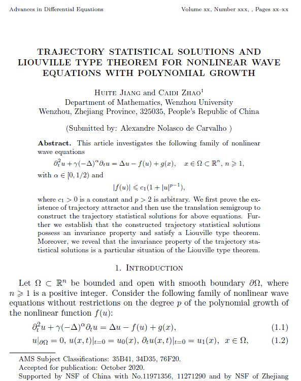 Jiang Huite, a year-three postgraduate student studying mathematics at the College of Mathematics and Physics, has published a research paper titled “Trajectory statistical solutions and Liouville type theorem for nonlinear wave equations with polynomial growth” as the first author in Advance in Differential Equations.