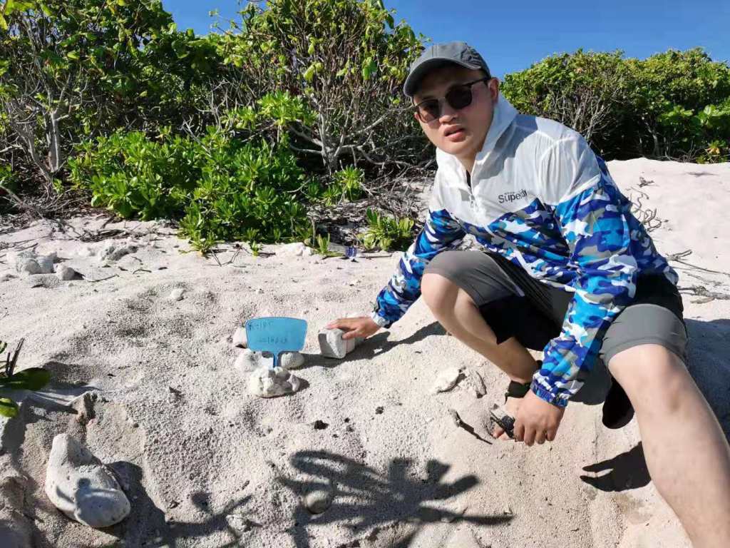 “At present, the main work is field investigation, and I’ll also do some experiments in the laboratory and record the data,” said Zhao Hongyun. As turtles come ashore at midnight to lay their eggs, so every morning at 7:30 a.m., he starts to circle the island to check out the spawning situation of turtles coming ashore the night before. Ganquan island is not big. It takes about 40 minutes to travel around this island. As there’s no means of transportation there, one has to walk. But Zhao enjoys walking around it.